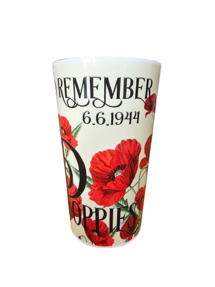Gobelet D-Day orné de coquelicots rouges avec inscription « Remember 6.6.1944 ». Un objet commémoratif fort et élégant.